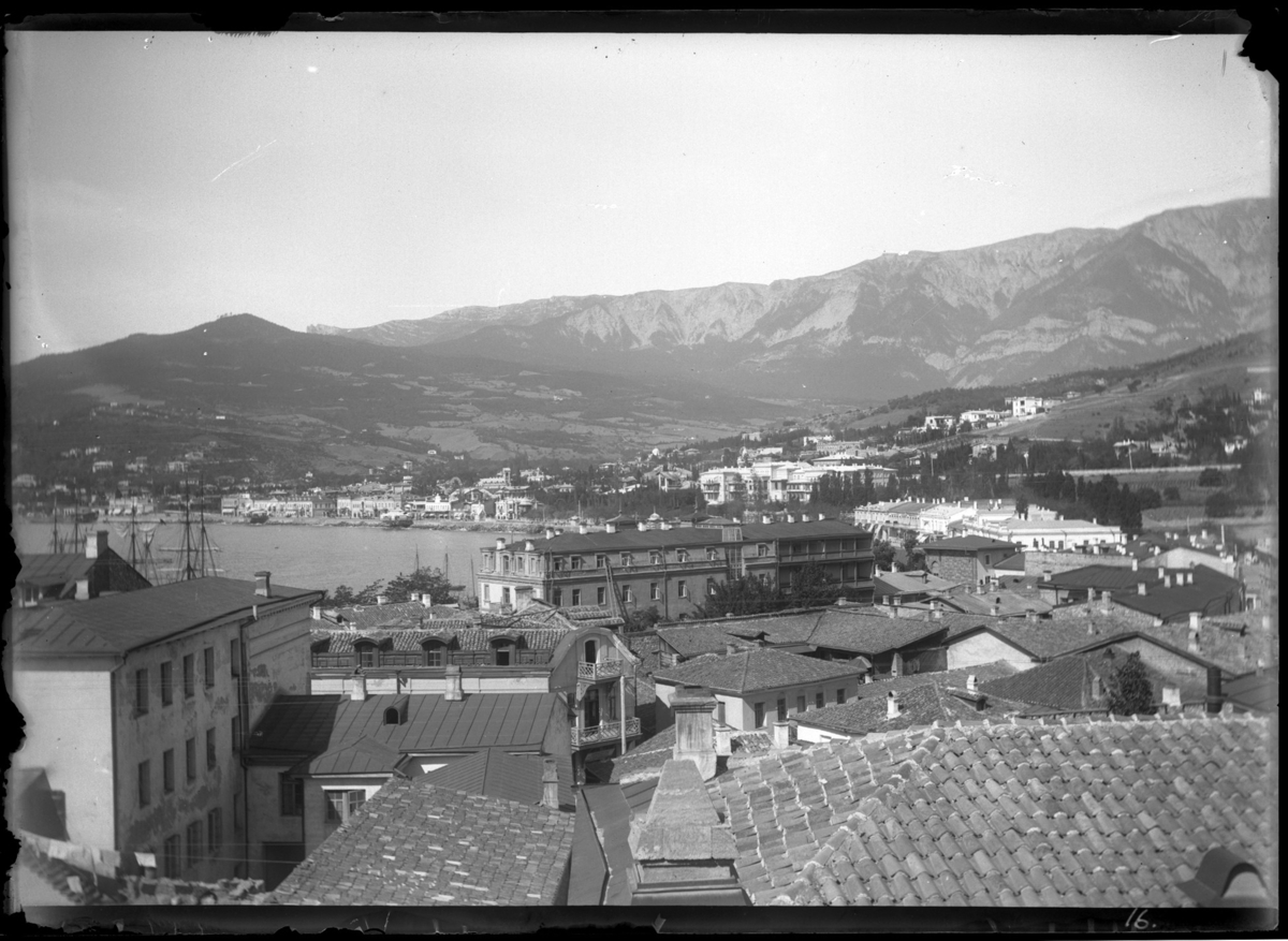 'Vy över hustak och hus med hamn på avstånd, båtar i hamnen och i fonden berg. :: :: Ingår i serie med fotonr. 5280:1-17. Se även fotonr. 5269-5292 med bilder från Stuxbergs resa till Kaukasien.'