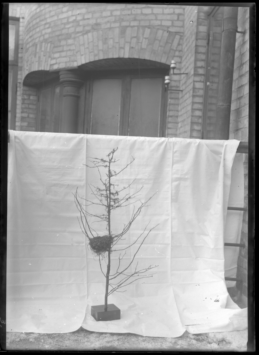 'Bilden tagen framför hus med tegelvägg och fönster, skynke uppsatt framför. Framför skynket står en gren nedstucken i ett träblock, gren av barrträd och med ett troligen fågelbo i. :: :: Ingår i serie med fotonr. 5281:1-13. Se även fotonr. 5269-5292 med bilder från Stuxbergs resa till Kaukasien.'