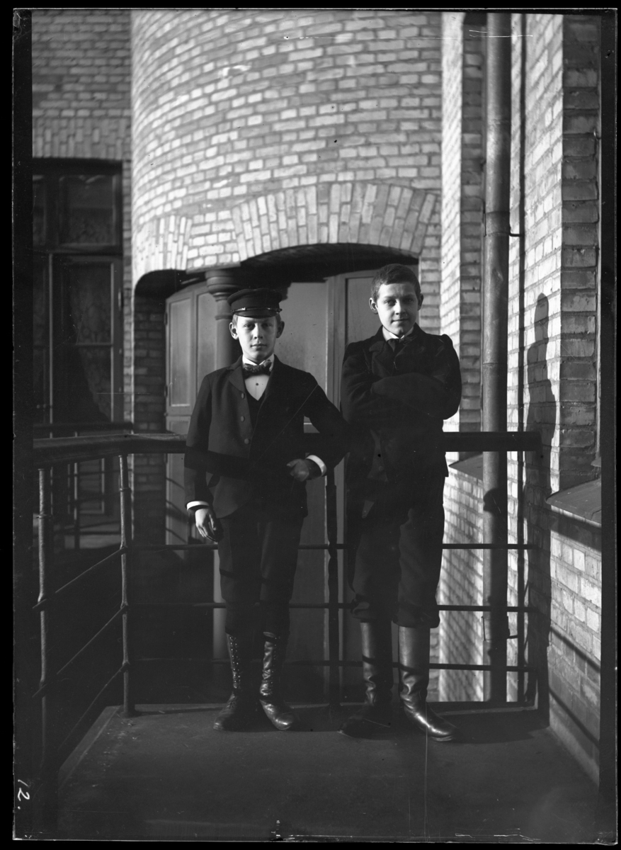 '2 pojkar stående farmför ytterväggen till ett hus, tegelvägg med fönster. Stående vid ett räcke. Kläder. Klädsel. :: :: Ingår i serie med fotonr. 5281:1-13. Se även fotonr. 5269-5292 med bilder från Stuxbergs resa till Kaukasien.'