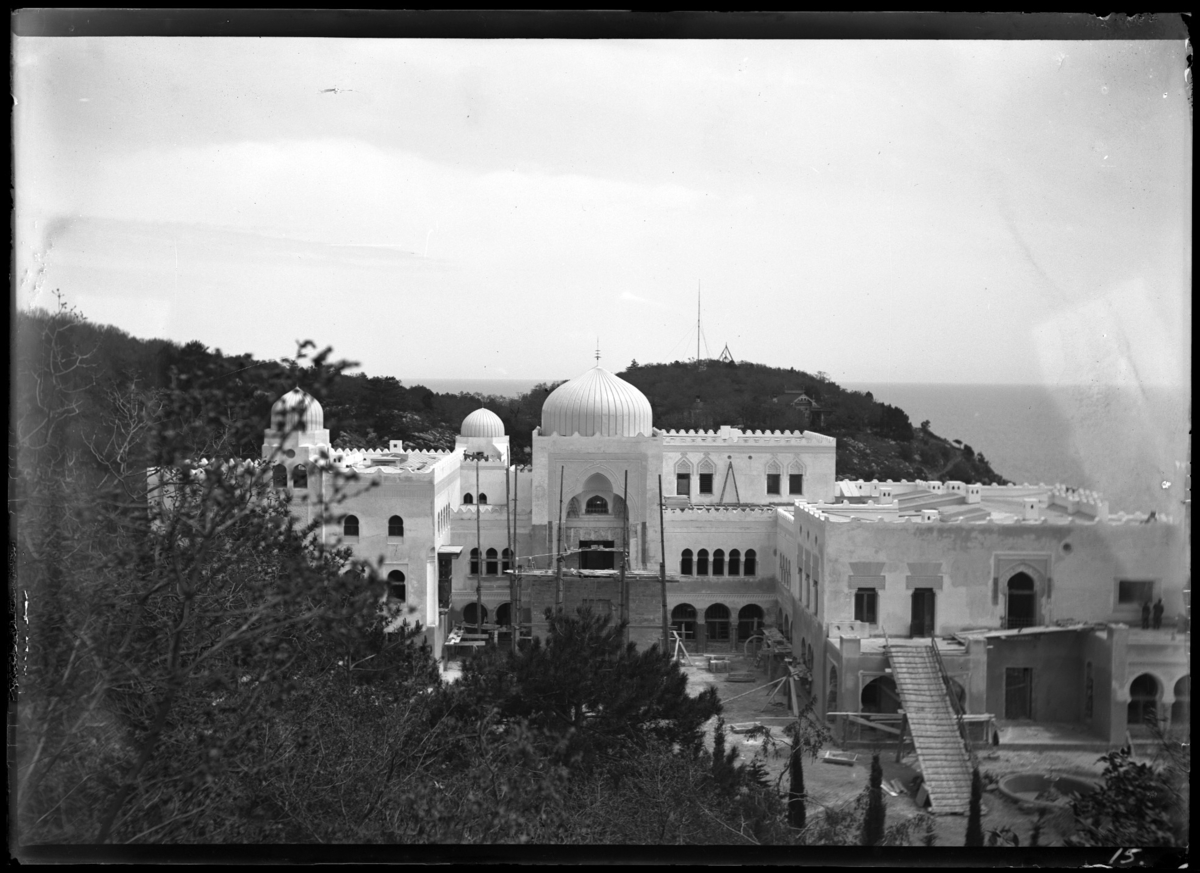 'Vy med byggnad med kupoler i förgrunden, med byggnadsställningar. Bakom skymtar hus och iberg och i fonden ev. havet. :: :: Ingår i serie med fotonr. 5282:1-15. Se även fotonr. 5269-5292 med bilder från Stuxbergs resa till Kaukasien.'