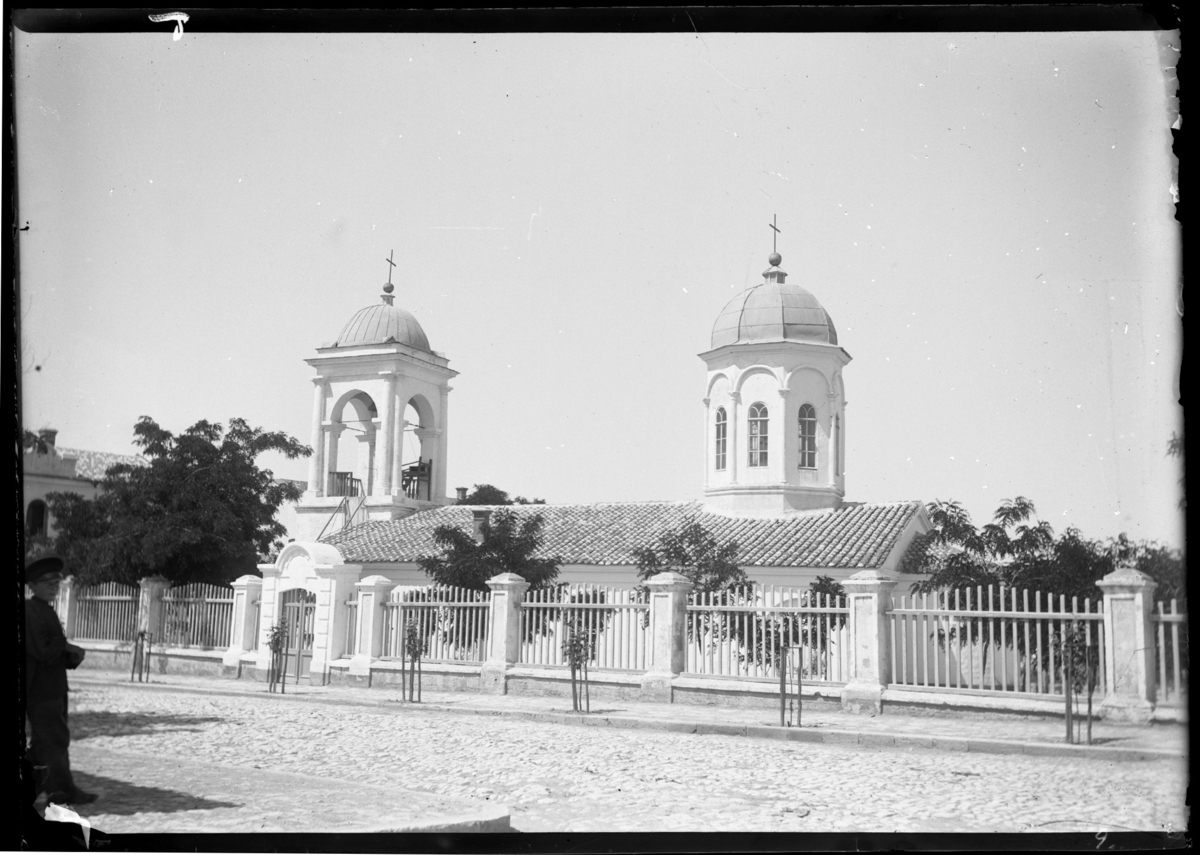 'Byggnad med 2 torn, kyrka, till vänster står 1 pojke. Kläder. Klädsel. :: :: Ingår i serie med fotonr. 5283:1-19. Se även fotonr. 5269-5292 med bilder från Stuxbergs resa till Kaukasien.'