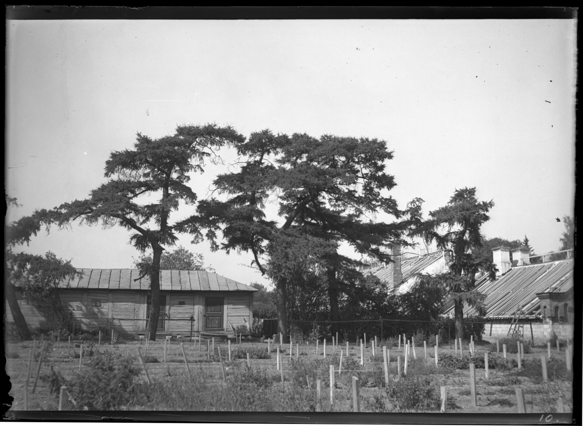 'Vy med 4 lärkträd och i bakgrunden träbyggnader. :: :: Ingår i serie med fotonr. 5286:1-18. Se även fotonr. 5269-5292 med bilder från Stuxbergs resa till Kaukasien.'