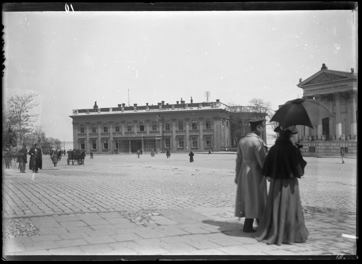 'Vy över kullerstenstorg med promenerande människor, kvinnor, män. På avstånd stor byggad och del av annan byggnad med pelare till höger. Kläder. Klädsel. På torget häst och vagn. Ekipage. Droska. Parasoll. :: :: Ingår i serie med fotonr. 5286:1-18. Se även fotonr. 5269-5292 med bilder från Stuxbergs resa till Kaukasien.'