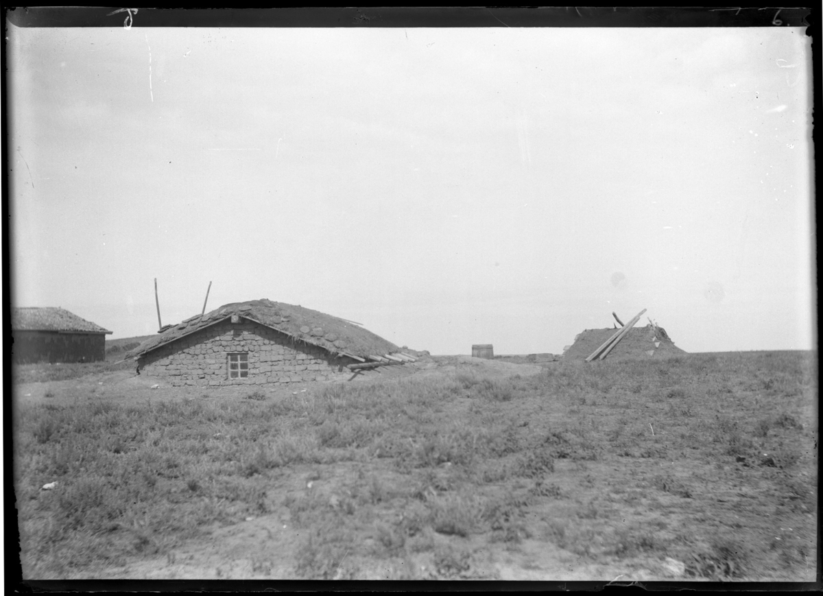 'Vy med öppet fält med uppstickande hustak. :: :: Ingår i serie med fotonr. 5287:1-22. Se även fotonr. 5269-5292 med bilder från Stuxbergs resa till Kaukasien.'