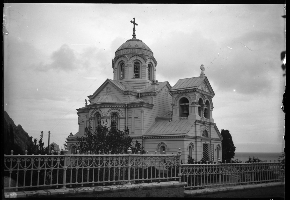 'I förgrunden ev. kyrka med staket framför. Hav i fonden. :: :: Ingår i serie med fotonr. 5287:1-22. Se även fotonr. 5269-5292 med bilder från Stuxbergs resa till Kaukasien.'