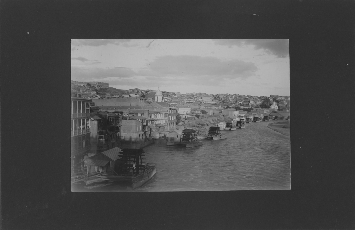 'Stadsvy med hus och byggnader, i förgrunden flod med vattendrivna hjul invid stranden. Hus med balkonger. :: :: Ingår i serie med fotonr. 5288:1-30. Se även fotonr. 5269-5292 med bilder från Stuxbergs resa till Kaukasien.'