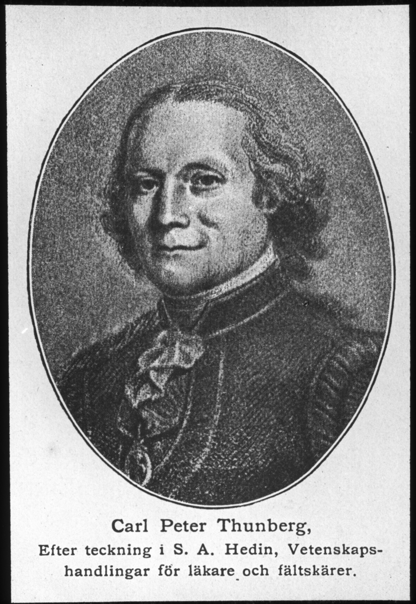 'Porträtt av Carl Peter Thunberg (Efter teckning av S. A. Hedin, Vetenskapshandlingar för läkare och fältskärer). :: :: Ingår i serie med fotonr. 5324:1-45 med repro från böcker eller publikationer. Dessa tillhör bilder som Leonard Axel Jägerskiöld använt i sina föreläsningar.'