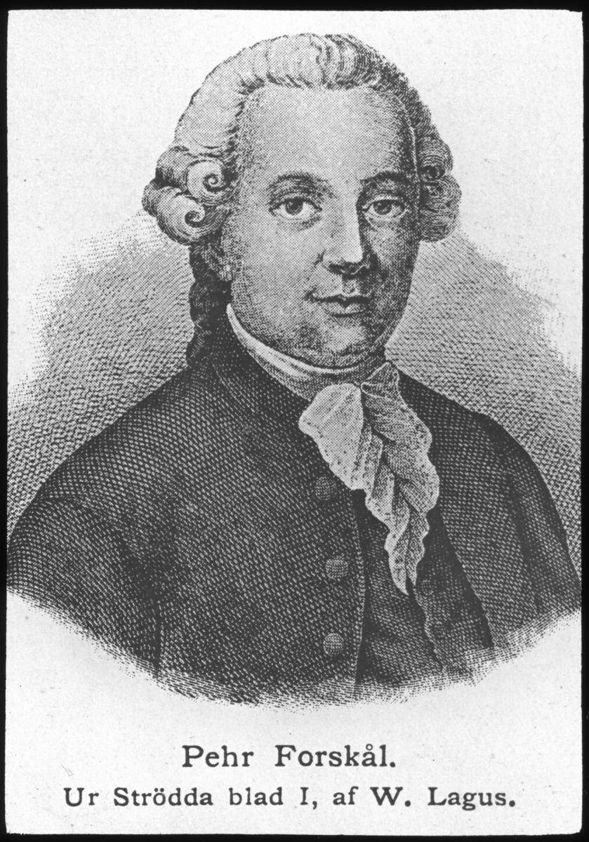 'Porträtt av Pehr Forskål. Ur Strödda blad I, av W. Lagus. :: :: Ingår i serie med fotonr. 5324:1-45 med repro från böcker eller publikationer. Dessa tillhör bilder som Leonard Axel Jägerskiöld använt i sina föreläsningar.'