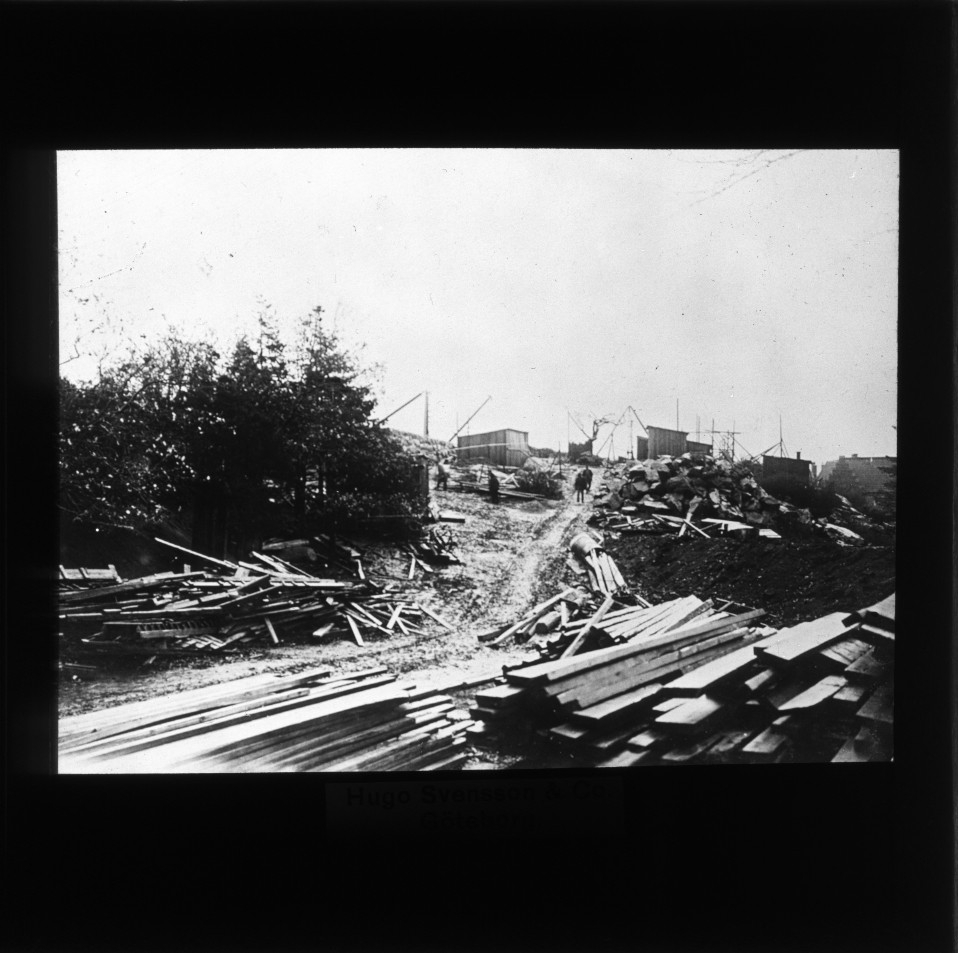 '''Svenska museer'' :: Diaduplikat av bilder i fotoarkivet. :: :: Plankor, människor och maskiner på en byggarbetsplats.'