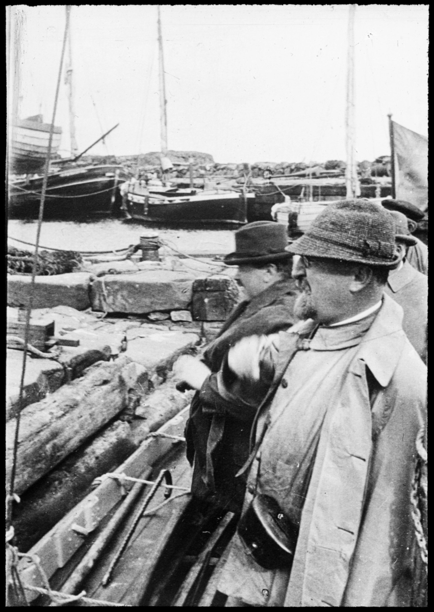'2 män varav Leonard Axel Jägerskiöld stående i förgrunden, ytterligare hattklädda huvuden i bakgrunden. Vy med båtar i hamn.' :: :: Ingår i serie med fotonr. 5370:1-5.'