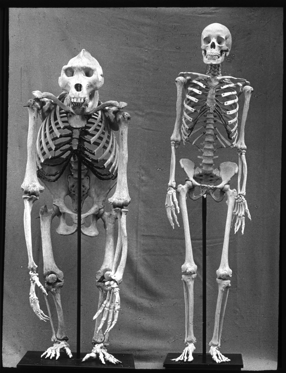'Skelett av människa och gorilla, stående intill varandra. :: :: Från Dr. Schlüter & Mass, Halle a S naturvetens. Läromedel. Numrerade Serie I.A. Nr 1-30. :: :: Ingår i serie med fotonr. 5374:1-30. Se även hela fotoserien 5374-5376.'