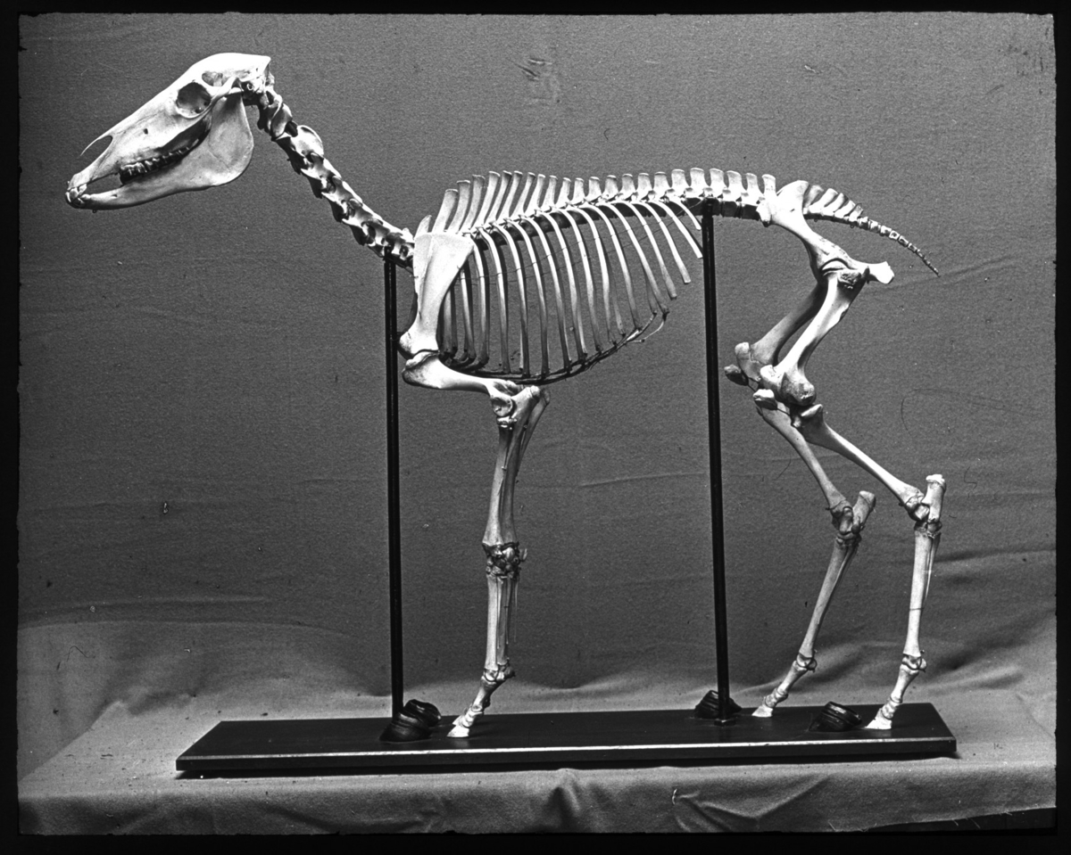 'Skelett av tamhäst. :: :: Från Dr. Schlüter & Mass, Halle a S naturvetens. Läromedel. Numrerade Serie I.A. Nr 1-30. :: :: Ingår i serie med fotonr. 5374:1-30. Se även hela fotoserien 5374-5376.'