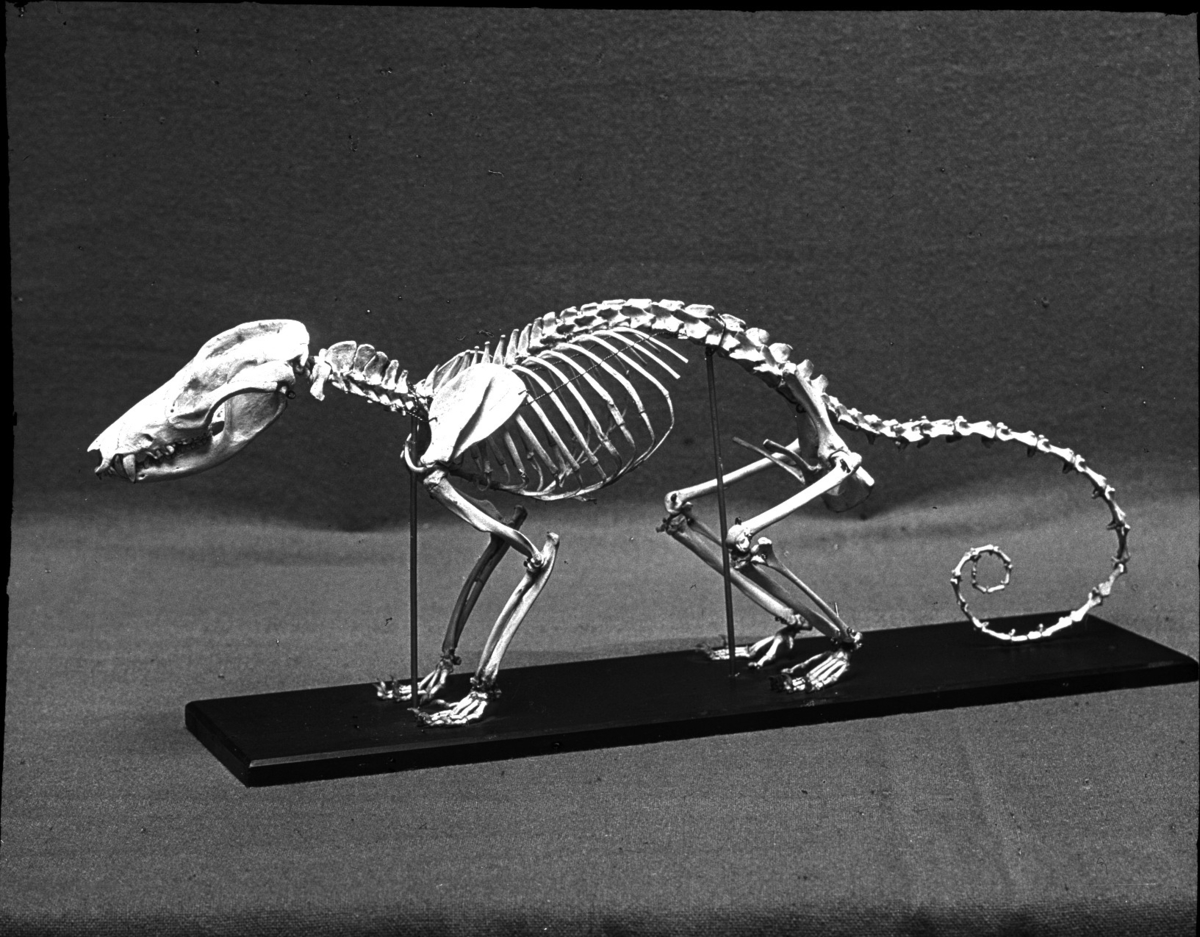 'Skelett av pungråtta. :: :: Från Dr. Schlüter & Mass, Halle a S naturvetens. Läromedel. Numrerade Serie I.A. Nr 1-30. :: :: Ingår i serie med fotonr. 5374:1-30. Se även hela fotoserien 5374-5376.'