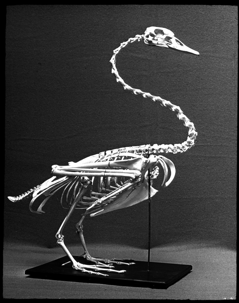 'Monterat skelett av sångsvan, sett från sidan. :: :: Från Dr. Schlüter & Mass, Halle a S naturvetens. Läromedel. Numrerad I.B. Nr. 12. :: :: Ingår i serie med fotonr. 5374:1-30. Se även hela fotoserien 5374-5376.'
