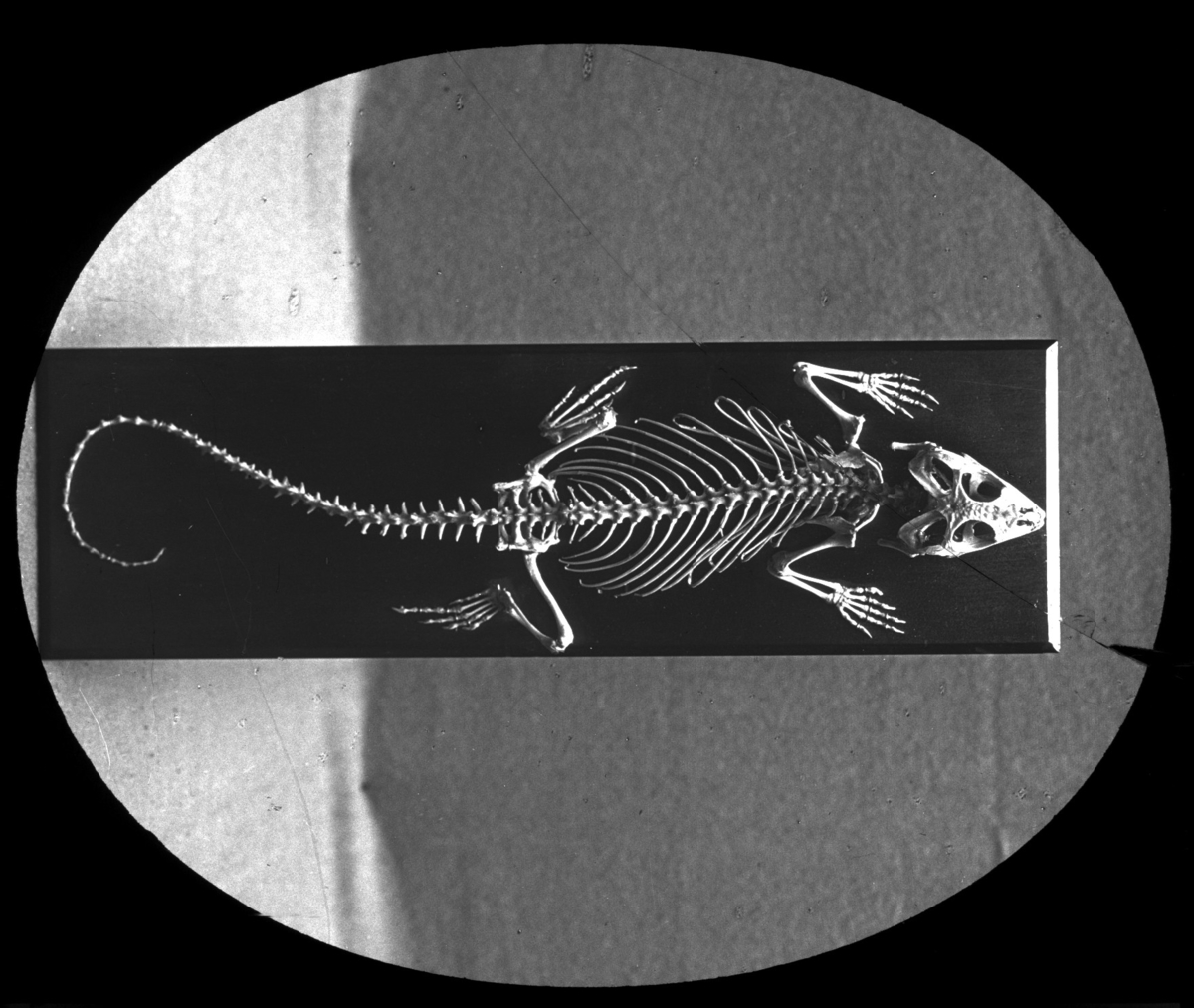 'Monterat skelett av skäggagam, sett från ryggsidan. :: :: Från Dr. Schlüter & Mass, Halle a S naturvetens. Läromedel. Numrerad I.C. Nr. 3. :: :: Ingår i serie med fotonr. 5374:1-30. Se även hela fotoserien 5374-5376.'