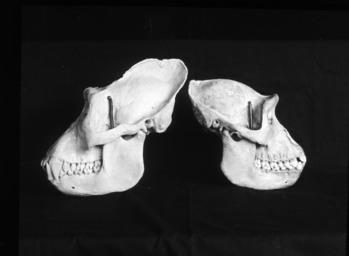 'Kranium av gorilla, hane och hona, sedda från sidan. Bilden numrerad II.A. Nr. 7. :: :: Ingår i serie med fotonr. 5376:1-20, bilder från Dr. Schlüter & Mass naturvetenskapliga läromedel, Halle a S. Serie II.A. Nr 1-20. Se även hela fotoserien 5374-5376.'