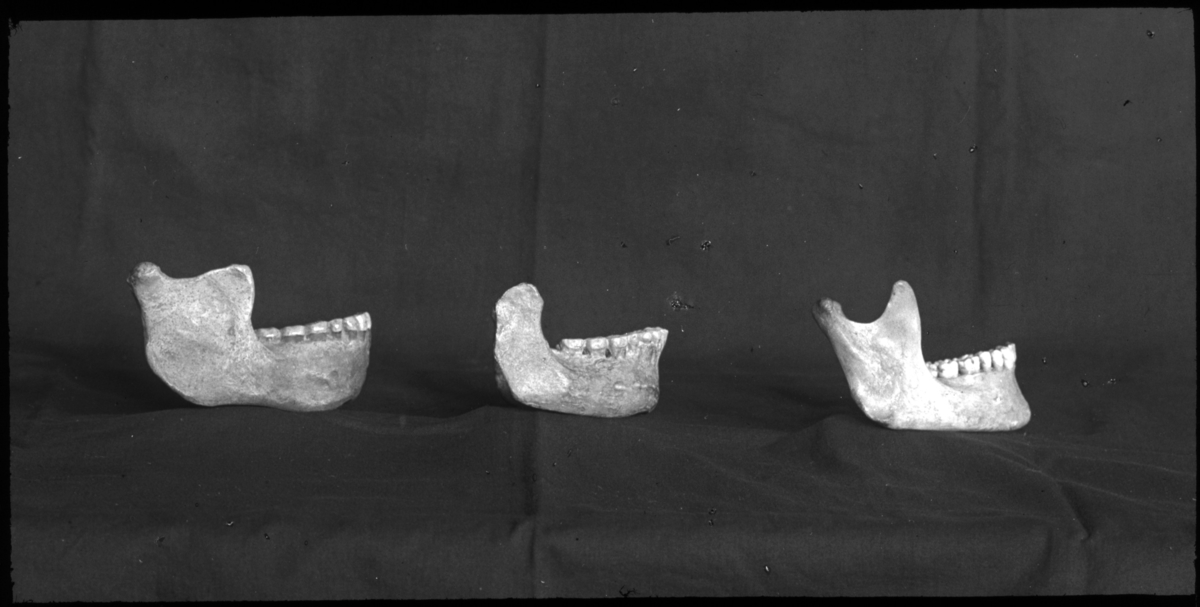 'Bildtext: ''Homo ex Heidelberg, Spy, Germania septentr. (mandib.)'' 3 underkäkar med tänder (mandibularbågar), sedda från sidan. Bilden numrerad II.A. Nr.18. :: :: Ingår i serie med fotonr. 5376:1-20, bilder från Dr. Schlüter & Mass naturvetenskapliga läromedel, Halle a S. Serie II.A. Nr 1-20. Se även hela fotoserien 5374-5376.'