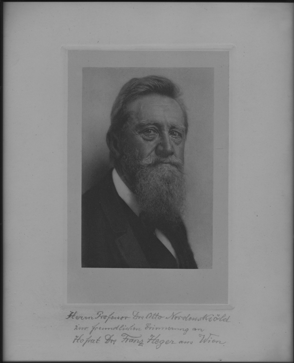 'Porträtt på 1 man. :: :: Enligt anteckning på framsidanav fotografiet: Herr Professor Dr. Otto Nordenskiöld zur freundlichen erinnerung an Hofrat Dr. Franz Heger ans Wien.'' På baksidan stämpel Professor Otto Nordenskiöld.'