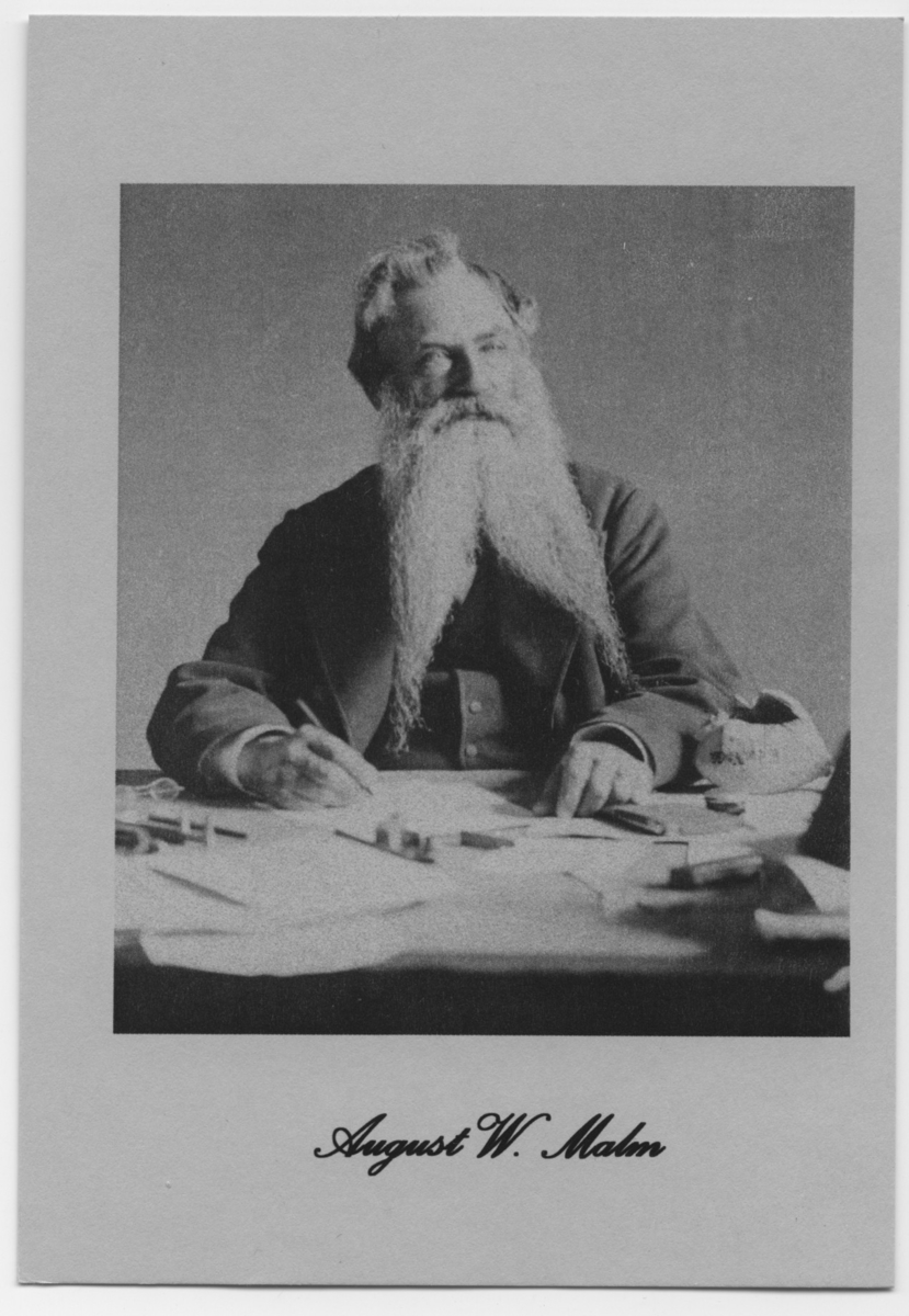 'Ingår i en serie med Fotonr. 5419 med Göteborgs Naturhistoriska museums olika vykort genom åren. :: :: Porträtt av August W. Malm sittande vid skrivbord.'