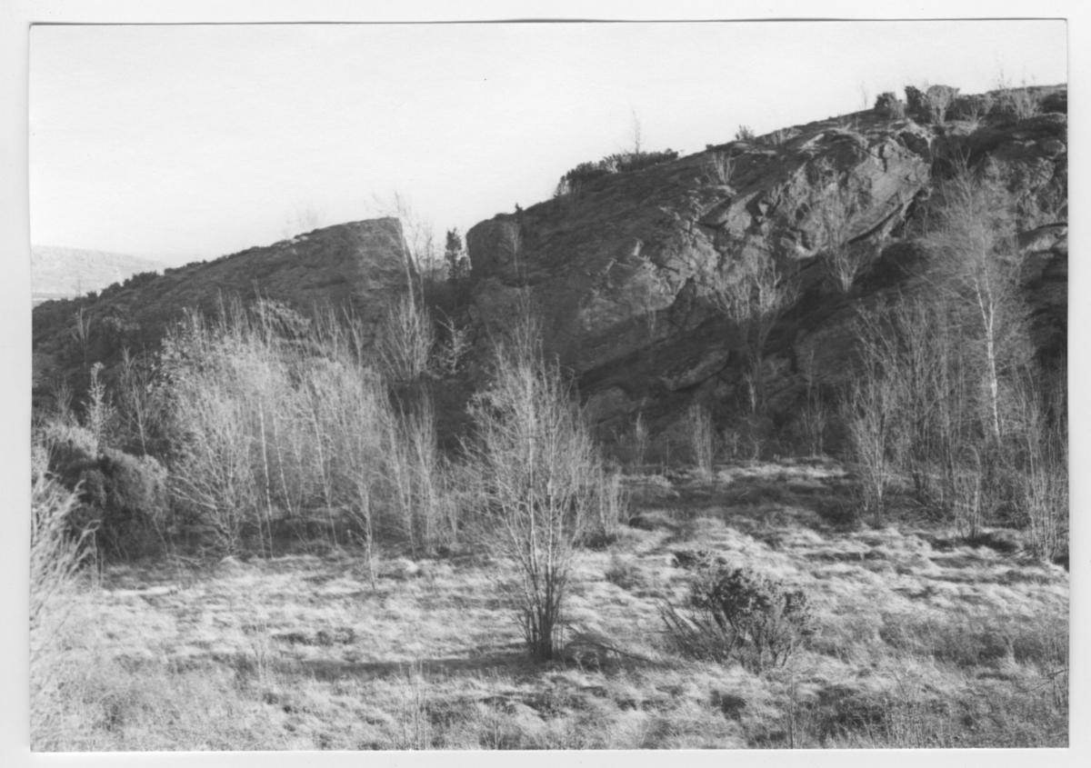 'Bildtext: ''Bergsparti med spricka. Riktning 118.'' :: :: Ingår i serie med fotonr. 6970:1-1125, dokumentation av Hisingens naturgeografi, visande landskapsformerna i stora drag och gjord inför exploateringen av området. Platserna för fotograferingen finns utsatta på karta i skala 1:4000 som finns på Göteborgs Naturhistoriska musem. Fotoriktningen mättes med kompass i gammalgrader.'