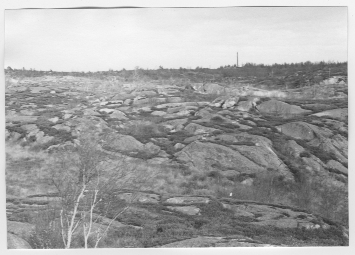 'Bildtext: ''Hällparti. Riktning 43.'' :: Vy över berghällsparti med ljung. :: :: Ingår i serie med fotonr. 6970:1-1125, dokumentation av Hisingens naturgeografi, visande landskapsformerna i stora drag och gjord inför exploateringen av området. Platserna för fotograferingen finns utsatta på karta i skala 1:4000 som finns på Göteborgs Naturhistoriska musem. Fotoriktningen mättes med kompass i gammalgrader.'