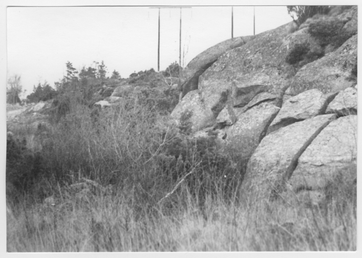 'Bildtext: ''Sprickdalsida. Riktning 29.'' Med enbuskar och högt gräs intill. :: :: Ingår i serie med fotonr. 6970:1-1125, dokumentation av Hisingens naturgeografi, visande landskapsformerna i stora drag och gjord inför exploateringen av området. Platserna för fotograferingen finns utsatta på karta i skala 1:4000 som finns på Göteborgs Naturhistoriska musem. Fotoriktningen mättes med kompass i gammalgrader.'