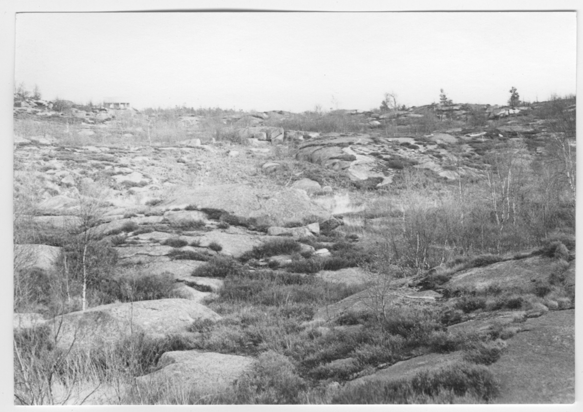 'Bildtext: ''Hällparti. Riktning 114.'' :: Vy över berghäll med ljung och björk. :: :: Ingår i serie med fotonr. 6970:1-1125, dokumentation av Hisingens naturgeografi, visande landskapsformerna i stora drag och gjord inför exploateringen av området. Platserna för fotograferingen finns utsatta på karta i skala 1:4000 som finns på Göteborgs Naturhistoriska musem. Fotoriktningen mättes med kompass i gammalgrader.'