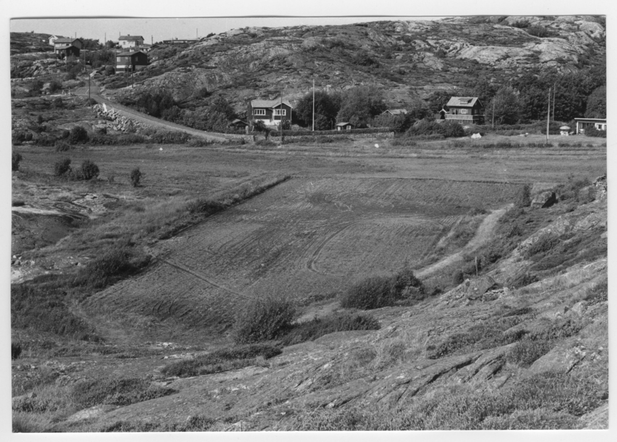 'Bildtext: ''Upplöjd sedimentdalgång. Riktning 0.'' Vy med liten åker i förgrunden. Ca 10 st hus längs grusväg. Omgivet av berghällar. :: :: Ingår i serie med fotonr. 6970:1-1125, dokumentation av Hisingens naturgeografi, visande landskapsformerna i stora drag och gjord inför exploateringen av området. Platserna för fotograferingen finns utsatta på karta i skala 1:4000 som finns på Göteborgs Naturhistoriska musem. Fotoriktningen mättes med kompass i gammalgrader.'