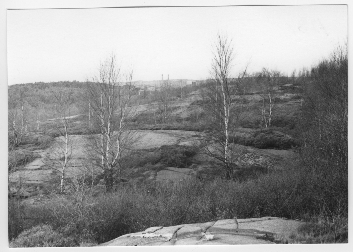 'Bildtext: ''Rundhällar. Riktning 264.'' :: Vy över berghällsparti med rundhällar med viss trädvegetation. Buskar och träd i sprickor. :: :: Ingår i serie med fotonr. 6970:1-1125, dokumentation av Hisingens naturgeografi, visande landskapsformerna i stora drag och gjord inför exploateringen av området. Platserna för fotograferingen finns utsatta på karta i skala 1:4000 som finns på Göteborgs Naturhistoriska musem. Fotoriktningen mättes med kompass i gammalgrader.'