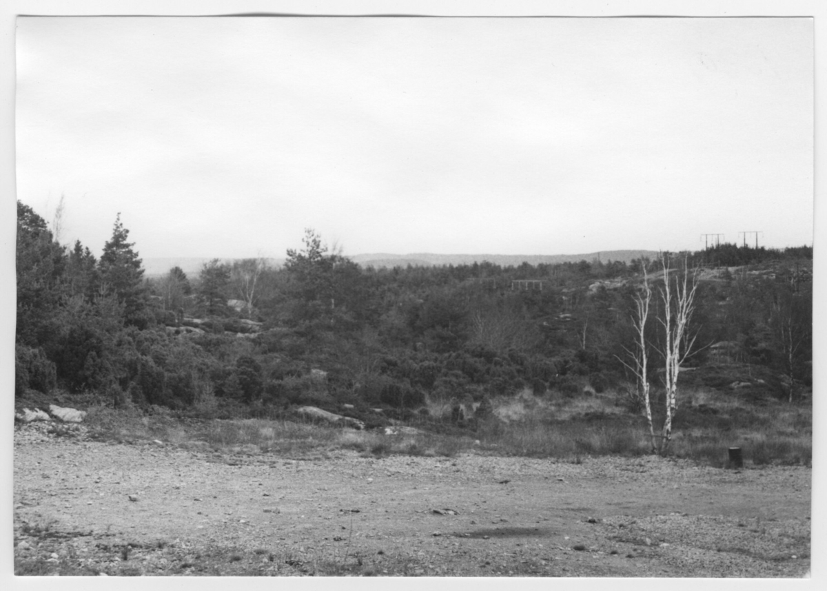 'Bildtext: ''Bergområde. Riktning 20.'' :: Vy med öppet fält i förgrunden och berghällar med barrträd och enbuskar. :: :: Ingår i serie med fotonr. 6970:1-1125, dokumentation av Hisingens naturgeografi, visande landskapsformerna i stora drag och gjord inför exploateringen av området. Platserna för fotograferingen finns utsatta på karta i skala 1:4000 som finns på Göteborgs Naturhistoriska musem. Fotoriktningen mättes med kompass i gammalgrader.'