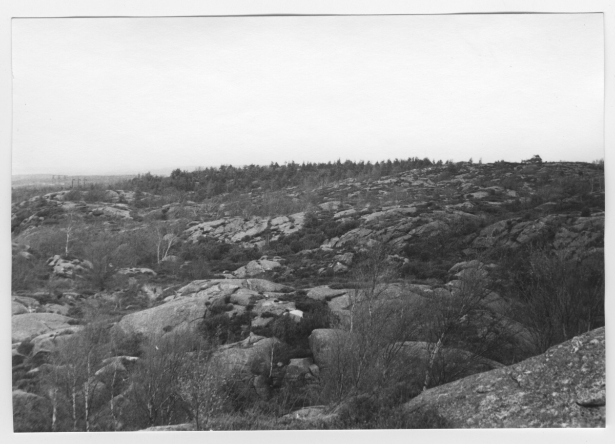 'Bildtext: ''Hällparti. Riktning 26.'' :: :: Ingår i serie med fotonr. 6970:1-1125, dokumentation av Hisingens naturgeografi, visande landskapsformerna i stora drag och gjord inför exploateringen av området. Platserna för fotograferingen finns utsatta på karta i skala 1:4000 som finns på Göteborgs Naturhistoriska musem. Fotoriktningen mättes med kompass i gammalgrader.'