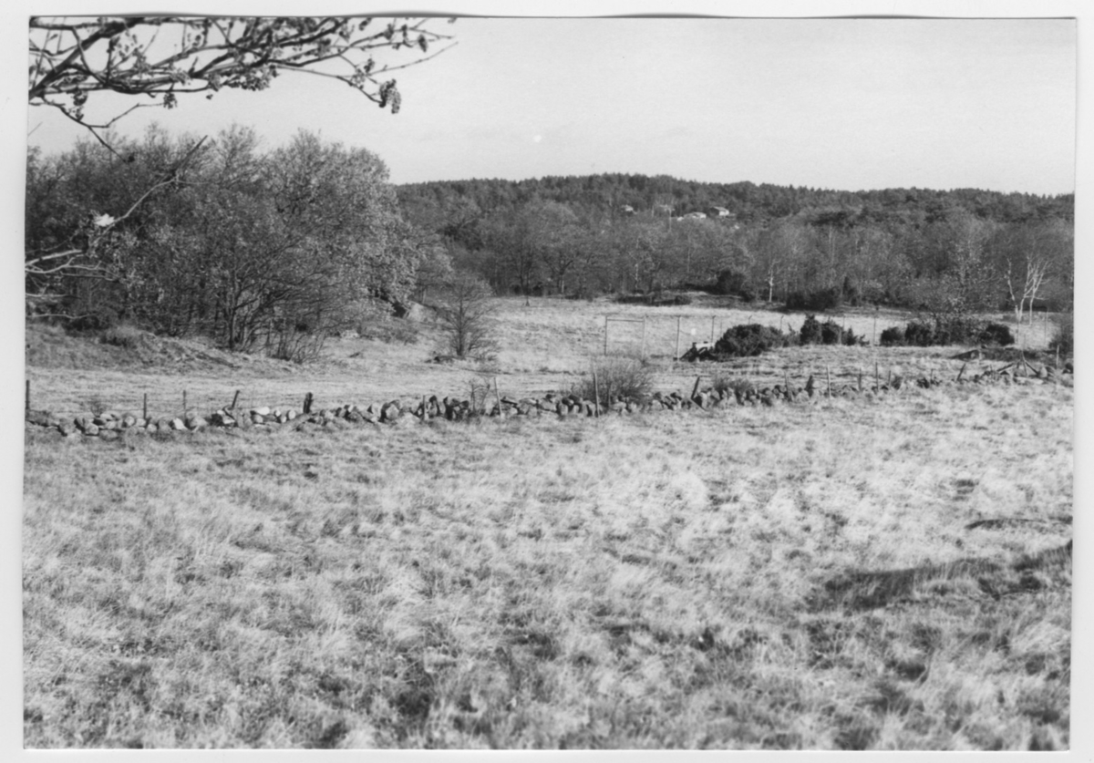 'Bildtext: ''Ängsmark. Riktning 30.'' :: Vy med öppet fält, ängsmark med stenmur. På avstånd ligger hus upp på berget. Stengärdesgård. :: :: Ingår i serie med fotonr. 6970:1-1125, dokumentation av Hisingens naturgeografi, visande landskapsformerna i stora drag och gjord inför exploateringen av området. Platserna för fotograferingen finns utsatta på karta i skala 1:4000 som finns på Göteborgs Naturhistoriska musem. Fotoriktningen mättes med kompass i gammalgrader.'