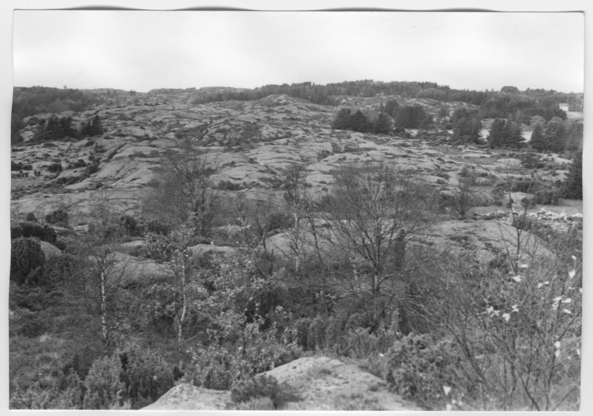 'Bildtext: ''Hällar. Riktning 254.'' :: Vy över delvis buskbevuxna berghällar och på avstånd ev. hus. :: :: Ingår i serie med fotonr. 6970:1-1125, dokumentation av Hisingens naturgeografi, visande landskapsformerna i stora drag och gjord inför exploateringen av området. Platserna för fotograferingen finns utsatta på karta i skala 1:4000 som finns på Göteborgs Naturhistoriska musem. Fotoriktningen mättes med kompass i gammalgrader.'