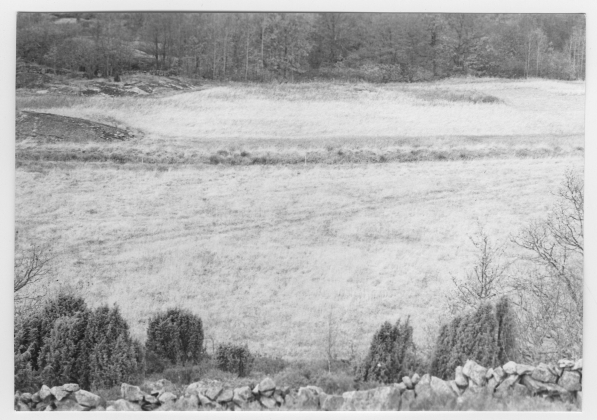 'Bildtext: ''Sedimentdalgång. Riktning 306.'' :: I förgrunden stenmur och enbuskar, vy ut över öppet fält, åkermark och i bakgrunden trädvegetation. Stengärdesgård. :: :: Ingår i serie med fotonr. 6970:1-1125, dokumentation av Hisingens naturgeografi, visande landskapsformerna i stora drag och gjord inför exploateringen av området. Platserna för fotograferingen finns utsatta på karta i skala 1:4000 som finns på Göteborgs Naturhistoriska musem. Fotoriktningen mättes med kompass i gammalgrader.'