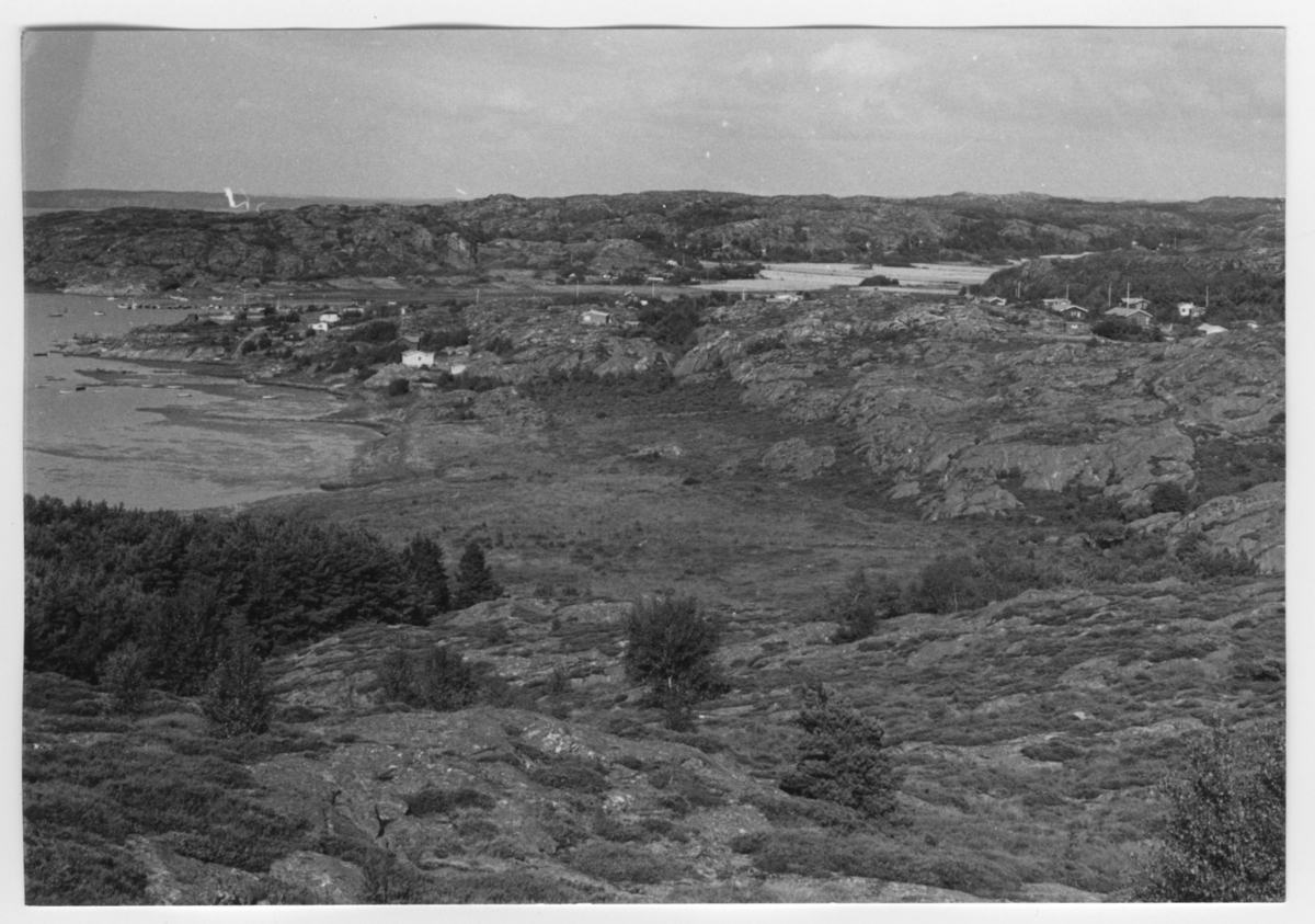 'Bildtext: ''Havsvik med strandäng. Tall i förgrunden i läläge. Riktning 44.'' Vy över berghällar med någon träd- och buskvegetation och hus ner mot havet. :: :: Ingår i serie med fotonr. 6970:1-1125, dokumentation av Hisingens naturgeografi, visande landskapsformerna i stora drag och gjord inför exploateringen av området. Platserna för fotograferingen finns utsatta på karta i skala 1:4000 som finns på Göteborgs Naturhistoriska musem. Fotoriktningen mättes med kompass i gammalgrader.'