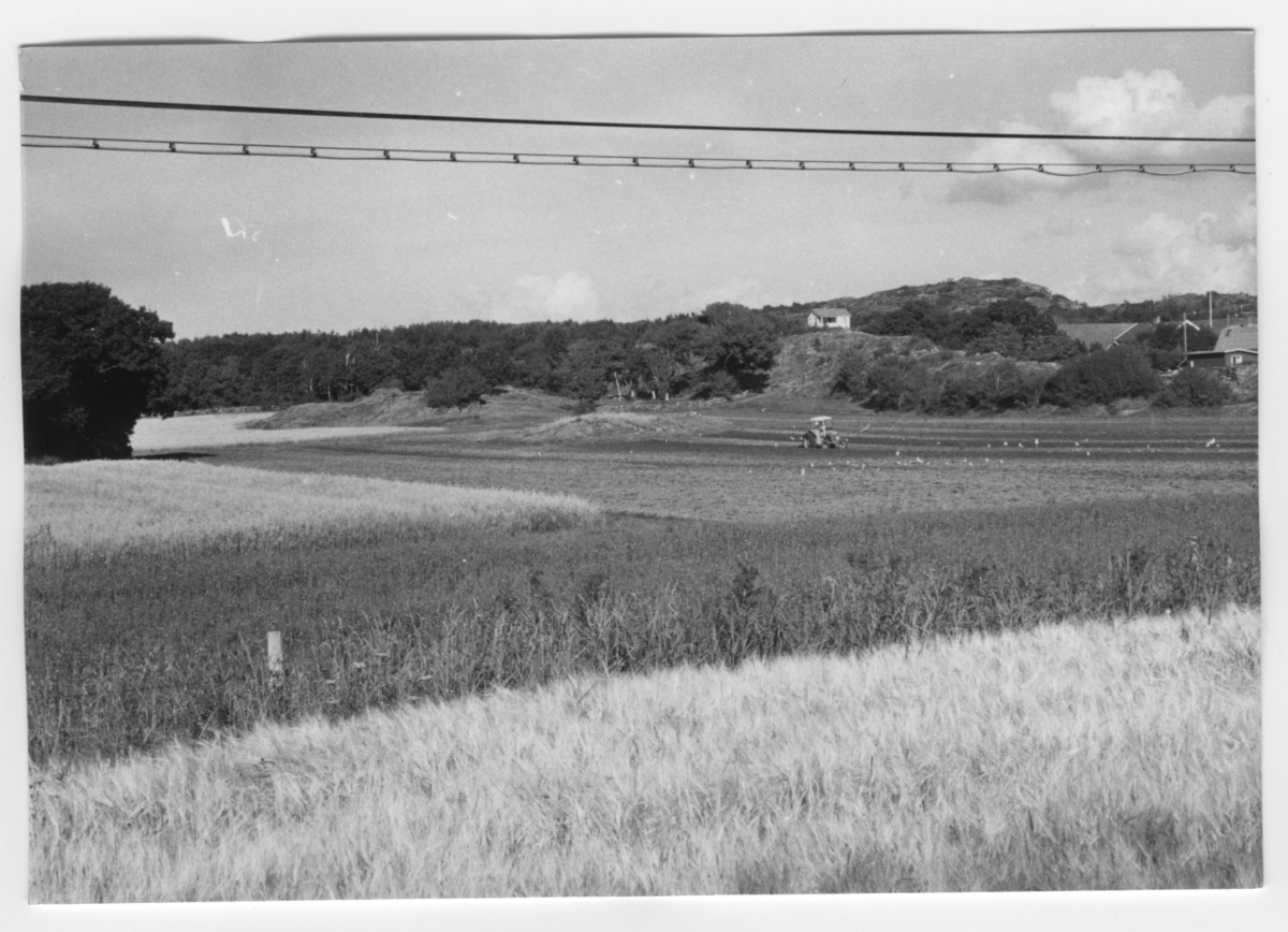 'Bildtext: ''Åkrar i sedimentdal. Riktning 68.'' 1 traktor i arbete på åker, hus på avstånd. :: :: Ingår i serie med fotonr. 6970:1-1125, dokumentation av Hisingens naturgeografi, visande landskapsformerna i stora drag och gjord inför exploateringen av området. Platserna för fotograferingen finns utsatta på karta i skala 1:4000 som finns på Göteborgs Naturhistoriska musem. Fotoriktningen mättes med kompass i gammalgrader.'