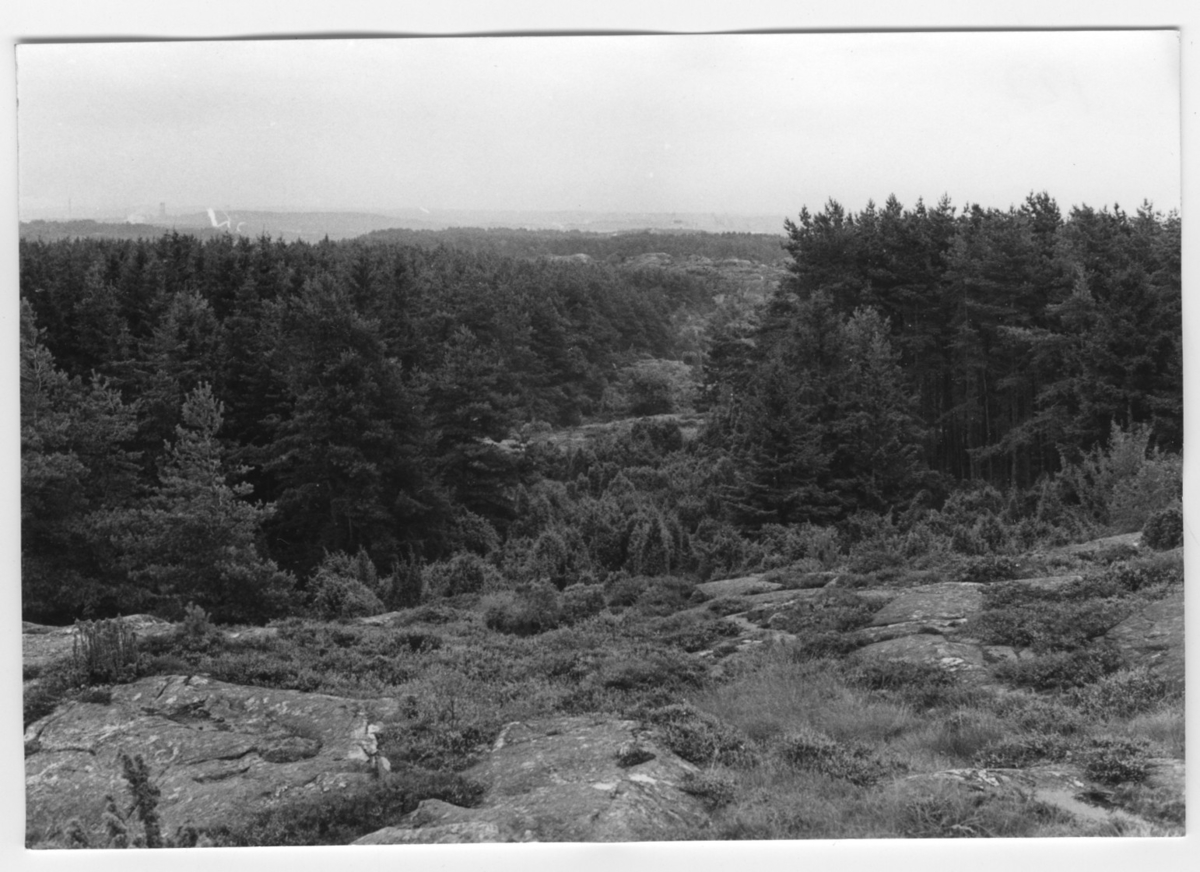 'Bildtext: ''Barrskog i läläge. Riktning 140.'' I förgrunden berghäll med ljung och envegetation. Barrträdsvegetation. :: :: Ingår i serie med fotonr. 6970:1-1125, dokumentation av Hisingens naturgeografi, visande landskapsformerna i stora drag och gjord inför exploateringen av området. Platserna för fotograferingen finns utsatta på karta i skala 1:4000 som finns på Göteborgs Naturhistoriska musem. Fotoriktningen mättes med kompass i gammalgrader.'