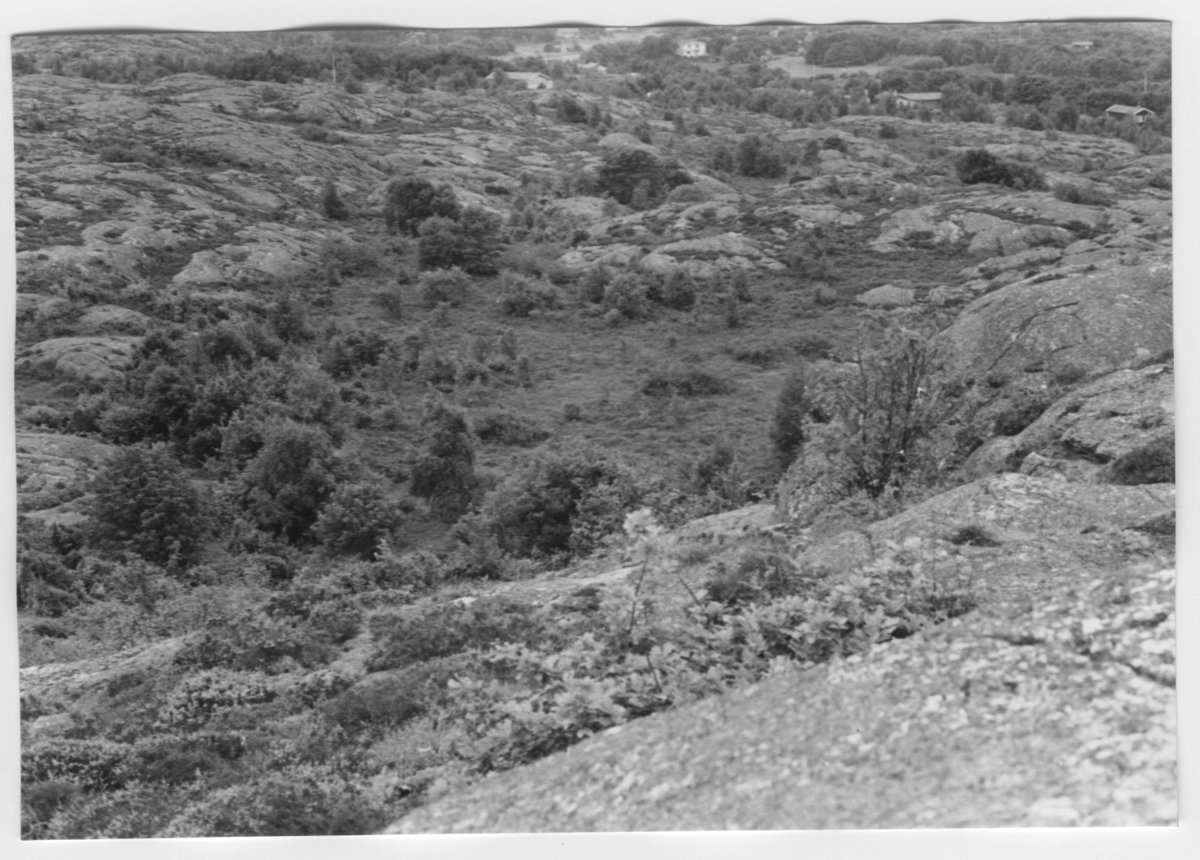 'Bildtext: ''Kärr i dalgång. Riktning 208.'' Vy ner mot kärr med omgivande kala berghällar. Hus på avstånd. :: :: Ingår i serie med fotonr. 6970:1-1125, dokumentation av Hisingens naturgeografi, visande landskapsformerna i stora drag och gjord inför exploateringen av området. Platserna för fotograferingen finns utsatta på karta i skala 1:4000 som finns på Göteborgs Naturhistoriska musem. Fotoriktningen mättes med kompass i gammalgrader.'