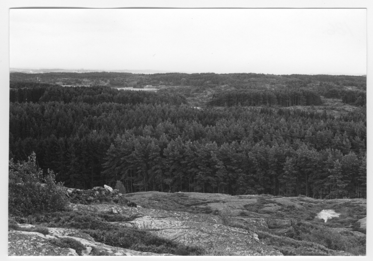 'Bildtext: ''Barrskogsområde. Riktning 152.'' :: Vy med berghäll i förgrunden med ev stenmur. Nedanför större område med barrträd (tall), på avstånd syns en gård. Stengärdesgård. :: :: Ingår i serie med fotonr. 6970:1-1125, dokumentation av Hisingens naturgeografi, visande landskapsformerna i stora drag och gjord inför exploateringen av området. Platserna för fotograferingen finns utsatta på karta i skala 1:4000 som finns på Göteborgs Naturhistoriska musem. Fotoriktningen mättes med kompass i gammalgrader.'