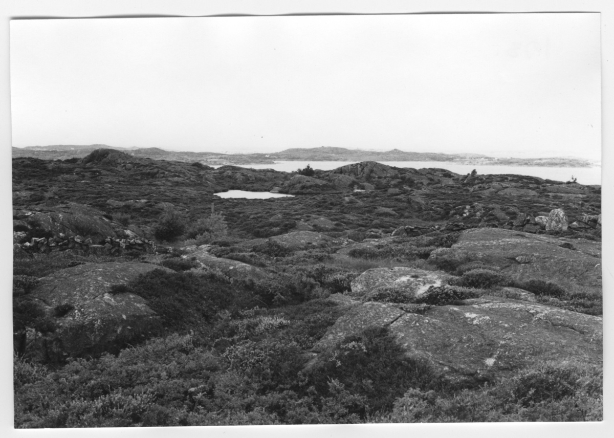 'Bildtext: ''Hällandskap. Riktning 290.'' :: Vy över berghällar med ljung och stenmur med sträckning vågrätt genom bilden. I fonden syns havet och på berghällen finns mindre vattensamling. Stengärdesgård. :: :: Ingår i serie med fotonr. 6970:1-1125, dokumentation av Hisingens naturgeografi, visande landskapsformerna i stora drag och gjord inför exploateringen av området. Platserna för fotograferingen finns utsatta på karta i skala 1:4000 som finns på Göteborgs Naturhistoriska musem. Fotoriktningen mättes med kompass i gammalgrader.'