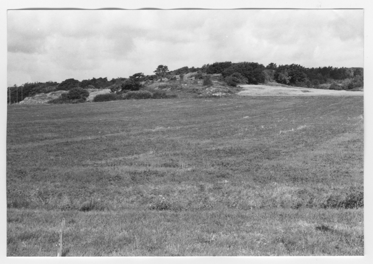 'Bildtext: ''Sedimentdalgång. Riktning 300.'' :: Vy över öppet fält med staket i angränsning till berg som är delvis busk och trädbevuxet. :: :: Ingår i serie med fotonr. 6970:1-1125, dokumentation av Hisingens naturgeografi, visande landskapsformerna i stora drag och gjord inför exploateringen av området. Platserna för fotograferingen finns utsatta på karta i skala 1:4000 som finns på Göteborgs Naturhistoriska musem. Fotoriktningen mättes med kompass i gammalgrader.'