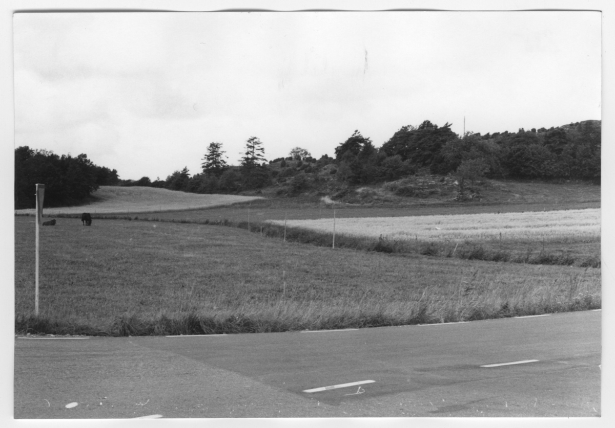 'Bildtext: ''Sedimentdalgång. Riktning 278.'' :: Vy med öppna fält, betesmark, åkrar, betande hästar och i förgrunden en väg. I bakgrunden berghällar med träd och buskvegetation, enbuskar. :: :: Ingår i serie med fotonr. 6970:1-1125, dokumentation av Hisingens naturgeografi, visande landskapsformerna i stora drag och gjord inför exploateringen av området. Platserna för fotograferingen finns utsatta på karta i skala 1:4000 som finns på Göteborgs Naturhistoriska musem. Fotoriktningen mättes med kompass i gammalgrader.'