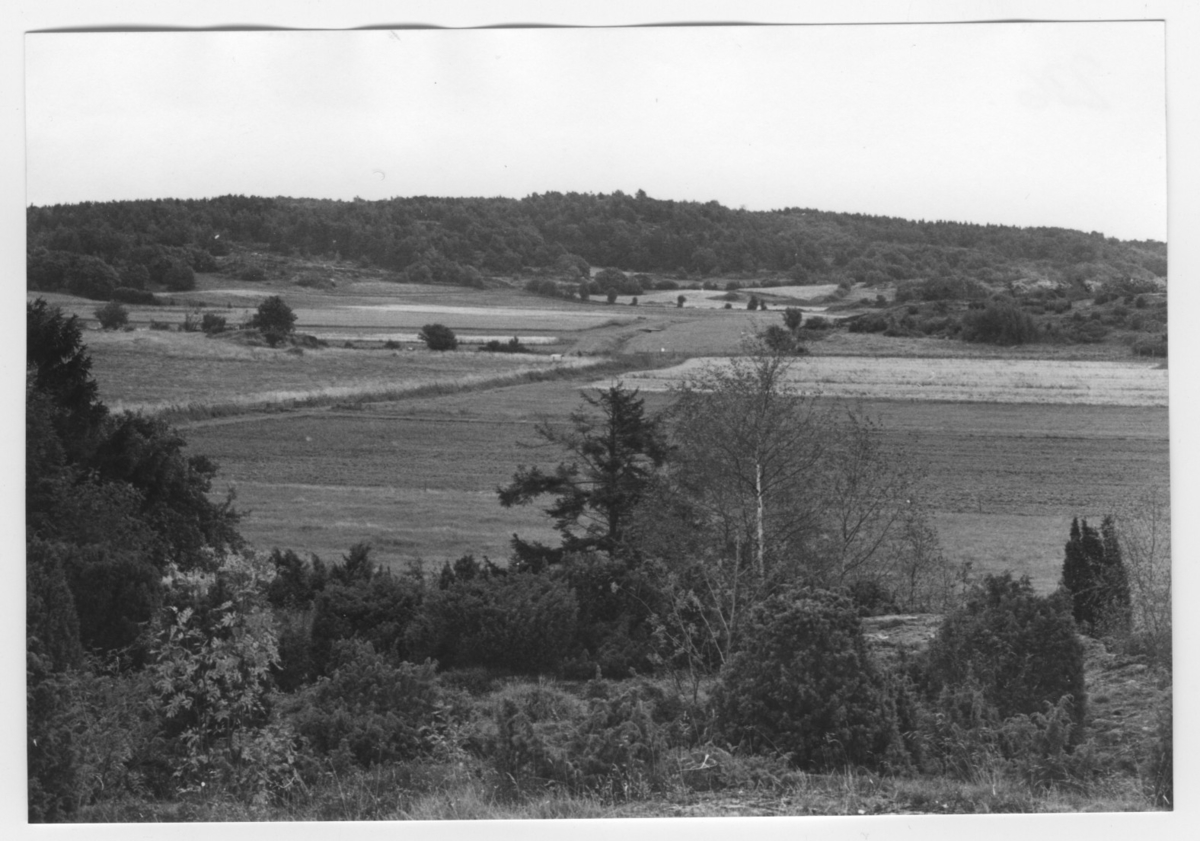 'Bildtext: ''Sedimentdalgång. Riktning 90.'' :: Vy över öppna fält, åkrar med enstaka träd och buskar. :: :: Ingår i serie med fotonr. 6970:1-1125, dokumentation av Hisingens naturgeografi, visande landskapsformerna i stora drag och gjord inför exploateringen av området. Platserna för fotograferingen finns utsatta på karta i skala 1:4000 som finns på Göteborgs Naturhistoriska musem. Fotoriktningen mättes med kompass i gammalgrader.'