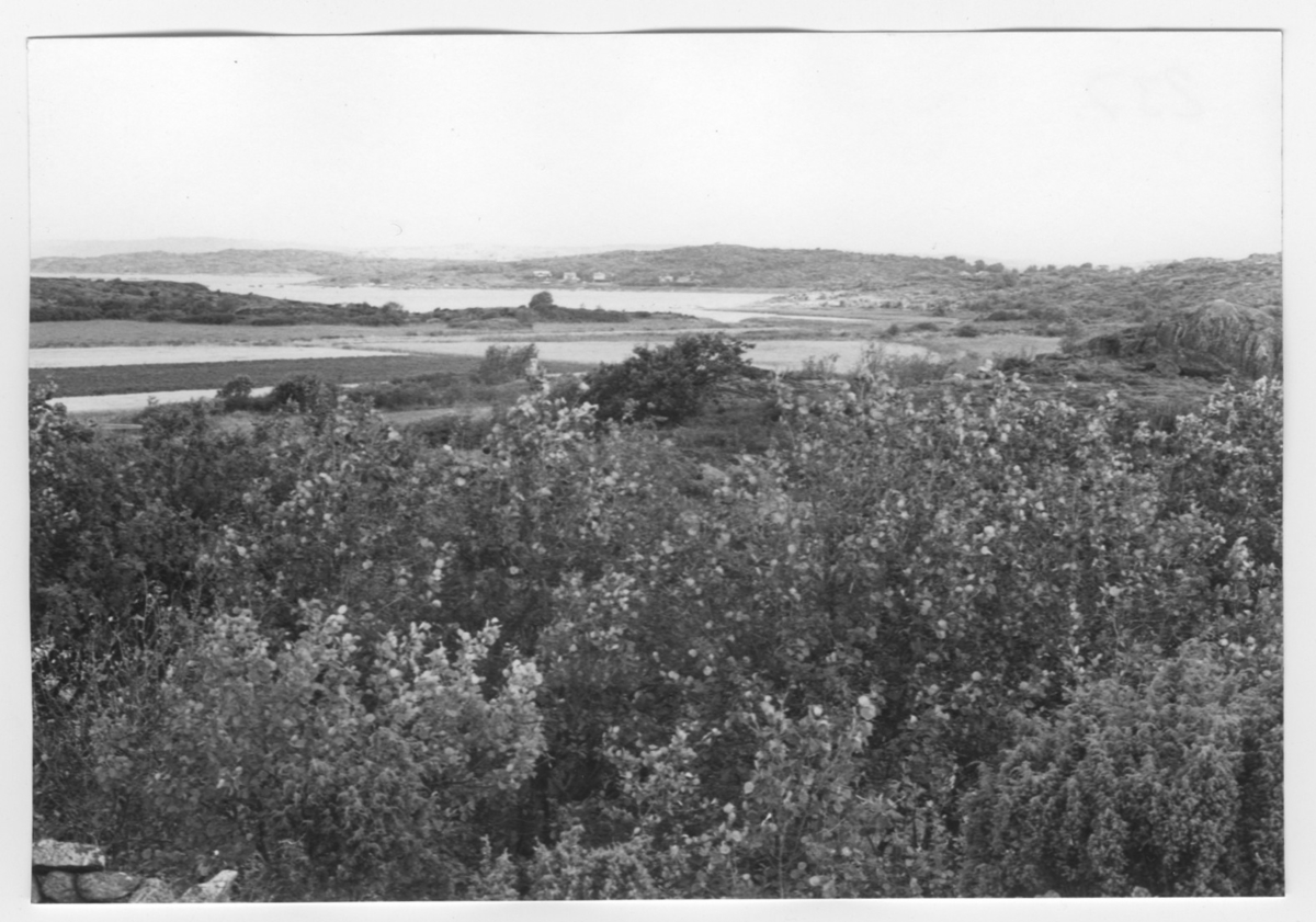 'Bildtext: ''Sedimentdals mynning mot Nordre älv. Riktning 0.'' :: Sedeimntdalen med öppna fält, åkrar (plastade) ner mot havet. I förgrunden och länge upp på land berghällar med viss träd och buskvegetation. :: :: Ingår i serie med fotonr. 6970:1-1125, dokumentation av Hisingens naturgeografi, visande landskapsformerna i stora drag och gjord inför exploateringen av området. Platserna för fotograferingen finns utsatta på karta i skala 1:4000 som finns på Göteborgs Naturhistoriska musem. Fotoriktningen mättes med kompass i gammalgrader.'
