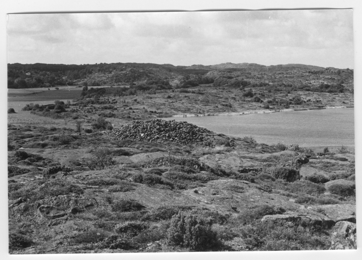 'Bildtext: ''Havsvik med rös. Riktning 230.'' :: Vy med berghällar och ner mot havet större rös med stenblock. På avstånd öppna fält, åkrar. :: :: Ingår i serie med fotonr. 6970:1-1125, dokumentation av Hisingens naturgeografi, visande landskapsformerna i stora drag och gjord inför exploateringen av området. Platserna för fotograferingen finns utsatta på karta i skala 1:4000 som finns på Göteborgs Naturhistoriska musem. Fotoriktningen mättes med kompass i gammalgrader.'