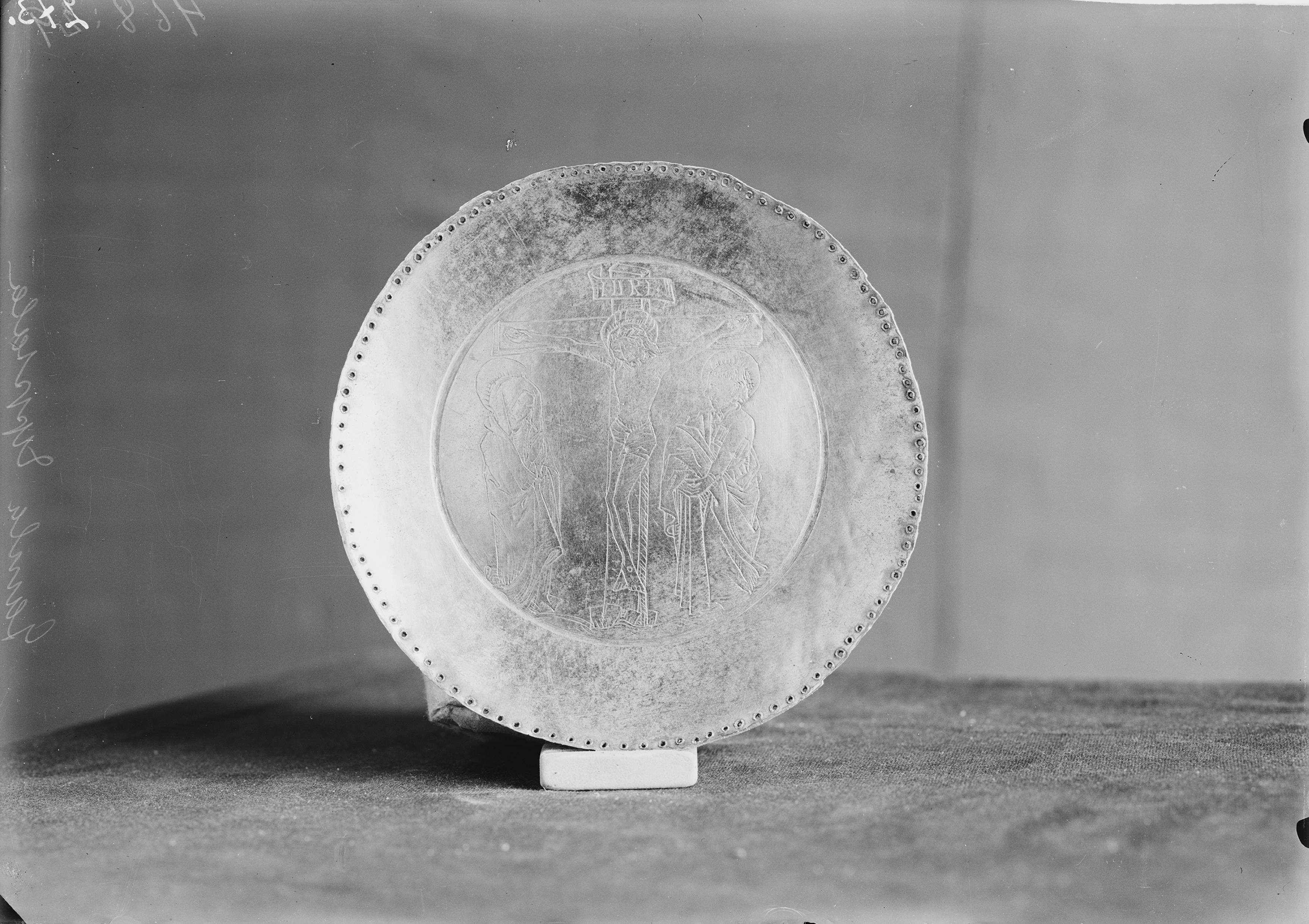 Paten, förgyllt silver. I mitten en graverad kalvariegrupp. 1400-talet.