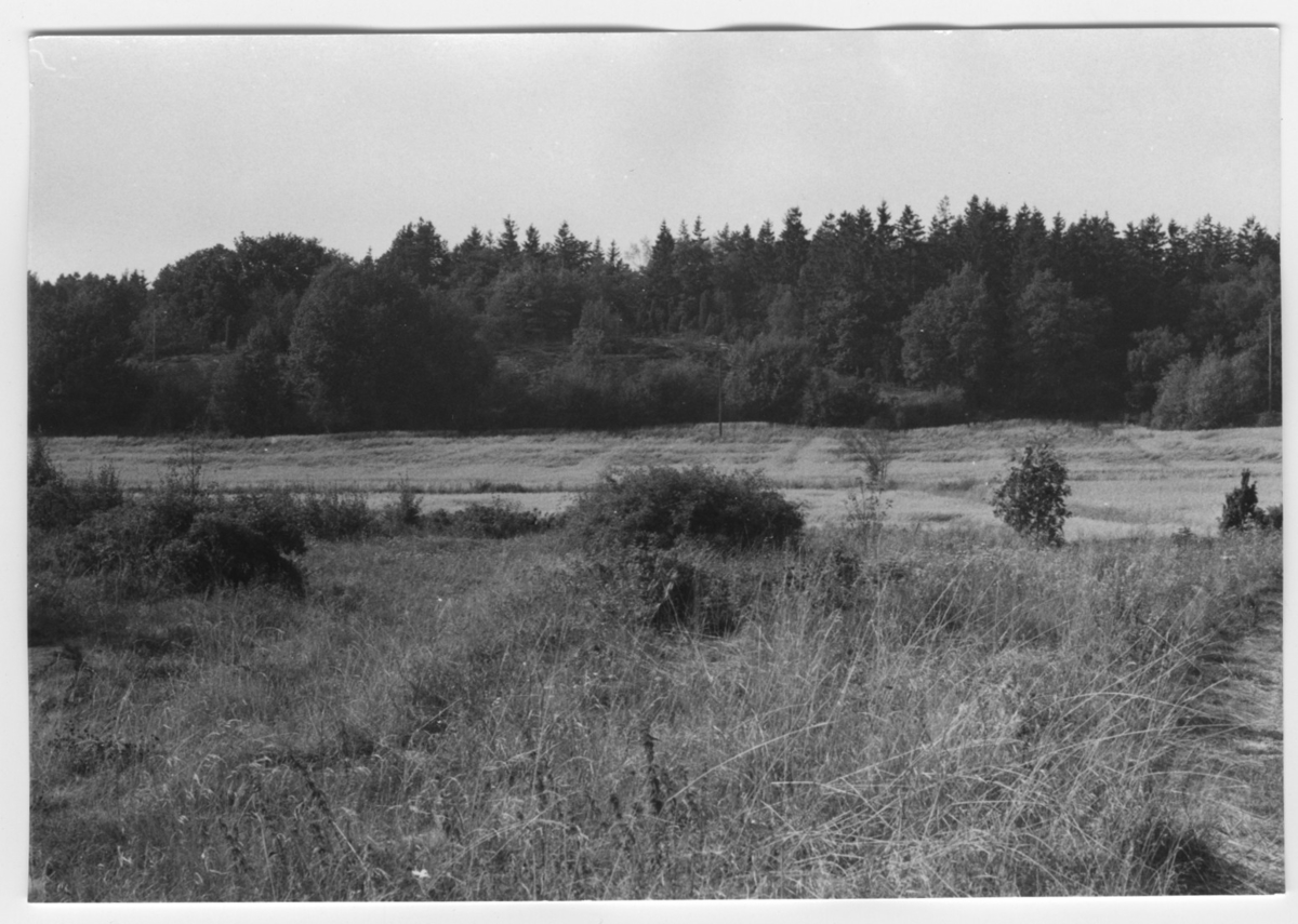 'Bildtext: ''Sedimentdalgång. Riktning 278.'' :: I förgrunden ev. ängsparti, vy ut över öppna fält, åker och på avstånd skogsparti på andra sidan dalgången. :: :: Ingår i serie med fotonr. 6970:1-1125, dokumentation av Hisingens naturgeografi, visande landskapsformerna i stora drag och gjord inför exploateringen av området. Platserna för fotograferingen finns utsatta på karta i skala 1:4000 som finns på Göteborgs Naturhistoriska musem. Fotoriktningen mättes med kompass i gammalgrader.'