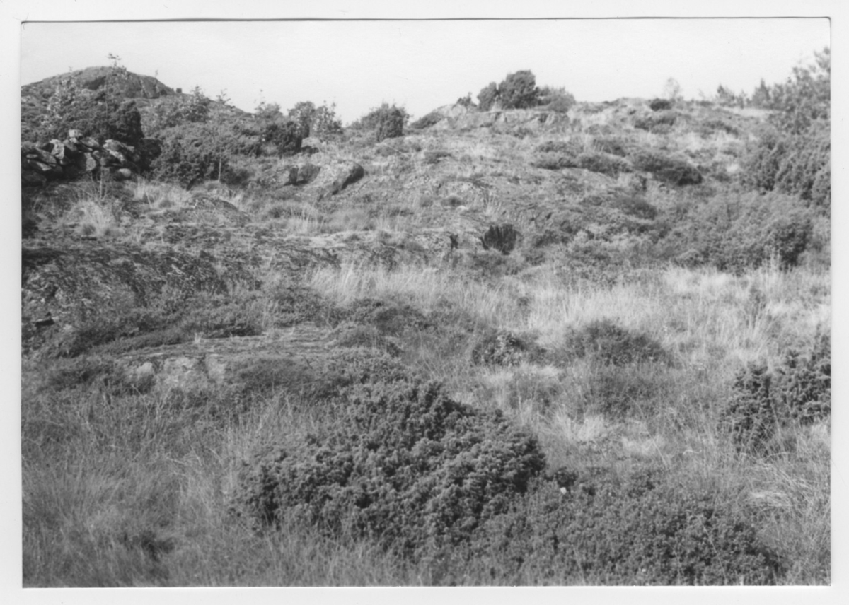 'Bildtext: ''Hällar med äng i förgrunden. Riktning 14.'' :: Vy med ängsmark med högt gräs och låga enbuskar, berghäll. :: :: Ingår i serie med fotonr. 6970:1-1125, dokumentation av Hisingens naturgeografi, visande landskapsformerna i stora drag och gjord inför exploateringen av området. Platserna för fotograferingen finns utsatta på karta i skala 1:4000 som finns på Göteborgs Naturhistoriska musem. Fotoriktningen mättes med kompass i gammalgrader.'