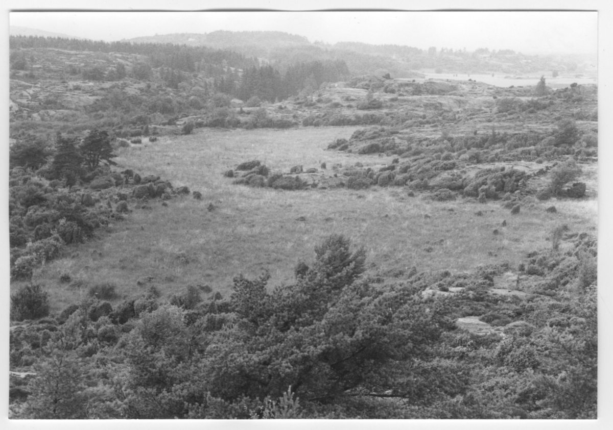 'Bildtext: ''Hällandskap med kärr. Riktning 332.'' :: Vy över berghällar med öppnare partier med kärr. Enbuskvegetation. :: :: Ingår i serie med fotonr. 6970:1-1125, dokumentation av Hisingens naturgeografi, visande landskapsformerna i stora drag och gjord inför exploateringen av området. Platserna för fotograferingen finns utsatta på karta i skala 1:4000 som finns på Göteborgs Naturhistoriska musem. Fotoriktningen mättes med kompass i gammalgrader.'
