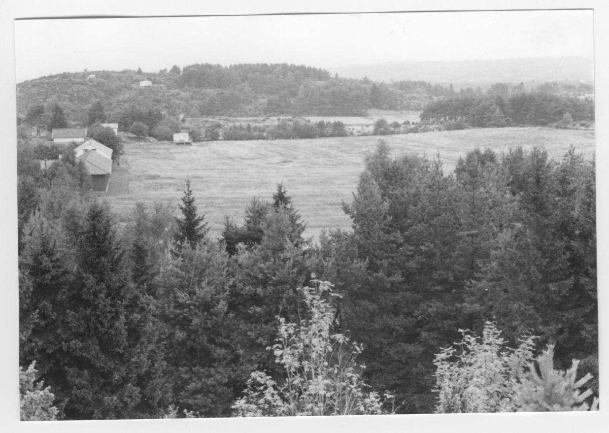 'Bildtext: ''Sedimentyta. Riktning 4.'' :: Vy med öppna fält, åkermark och omkringliggande område med barrträd och hus. :: :: Ingår i serie med fotonr. 6970:1-1125, dokumentation av Hisingens naturgeografi, visande landskapsformerna i stora drag och gjord inför exploateringen av området. Platserna för fotograferingen finns utsatta på karta i skala 1:4000 som finns på Göteborgs Naturhistoriska musem. Fotoriktningen mättes med kompass i gammalgrader.'